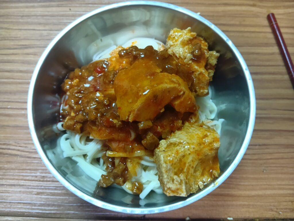 先煮好麵後撈起,然後不開罐直接把麻婆豆腐罐頭隔水加熱,熱了之後打開罐頭將麻婆豆腐拌到乾麵中,就可以吃了!