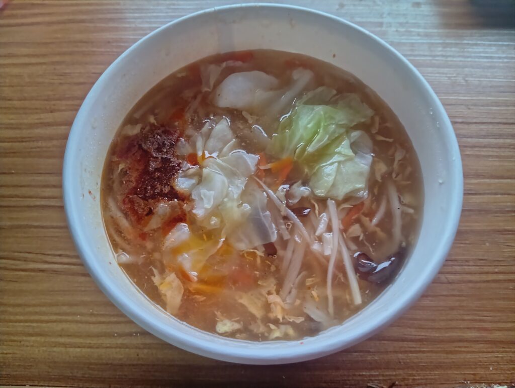 今天點的是肉羹麵,羹湯做得很黏稠,加上肉羹跟配料,真的很好吃,有時去全聯就會順便買個羹麵回家吃。