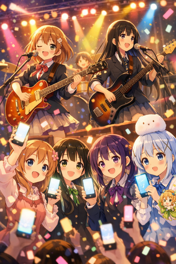 這是 ChatGPT 生成的『K-ON!輕音部 × 請問您今天要來點兔子嗎? 夢幻同樂會』概念圖。