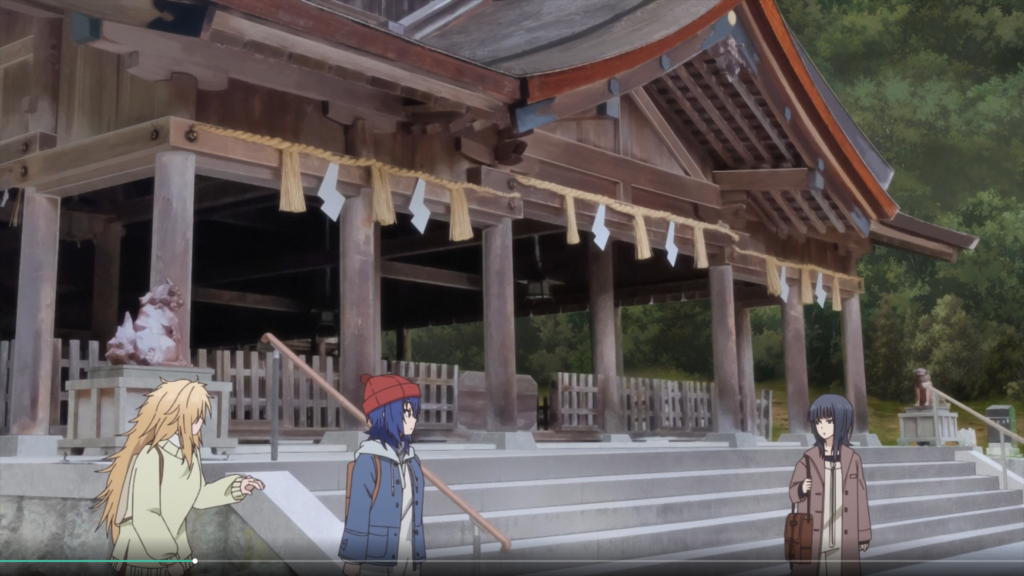 看了上一話,旅行到一半就結束了,於是很想快點看後續,所以今天晚上就看了這一話第12旅「我還要繼續去旅行喔」,這一話的開始,延續上一話搭錯車的後續,後來搭話的乘客說可以在下一站換車,就可以前往她們想去的目的地了,於是最後到達她們計劃要到的美保神社。
